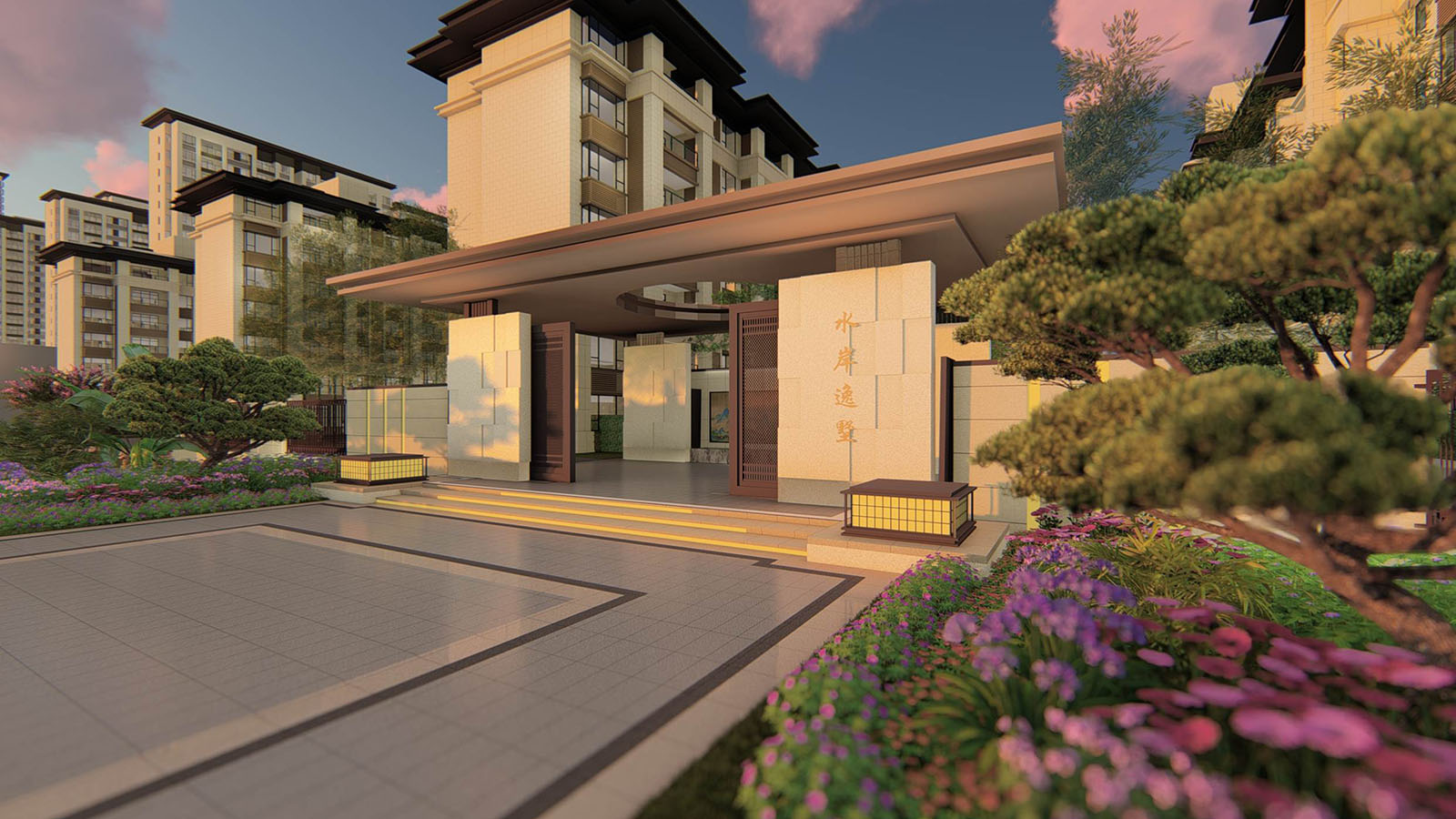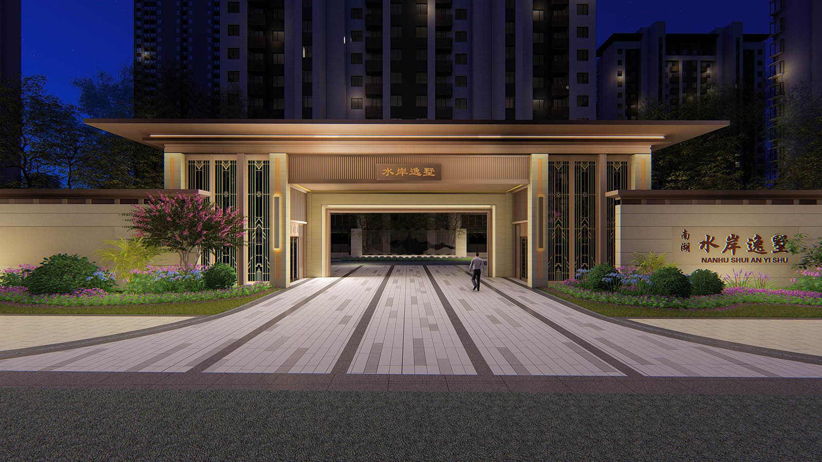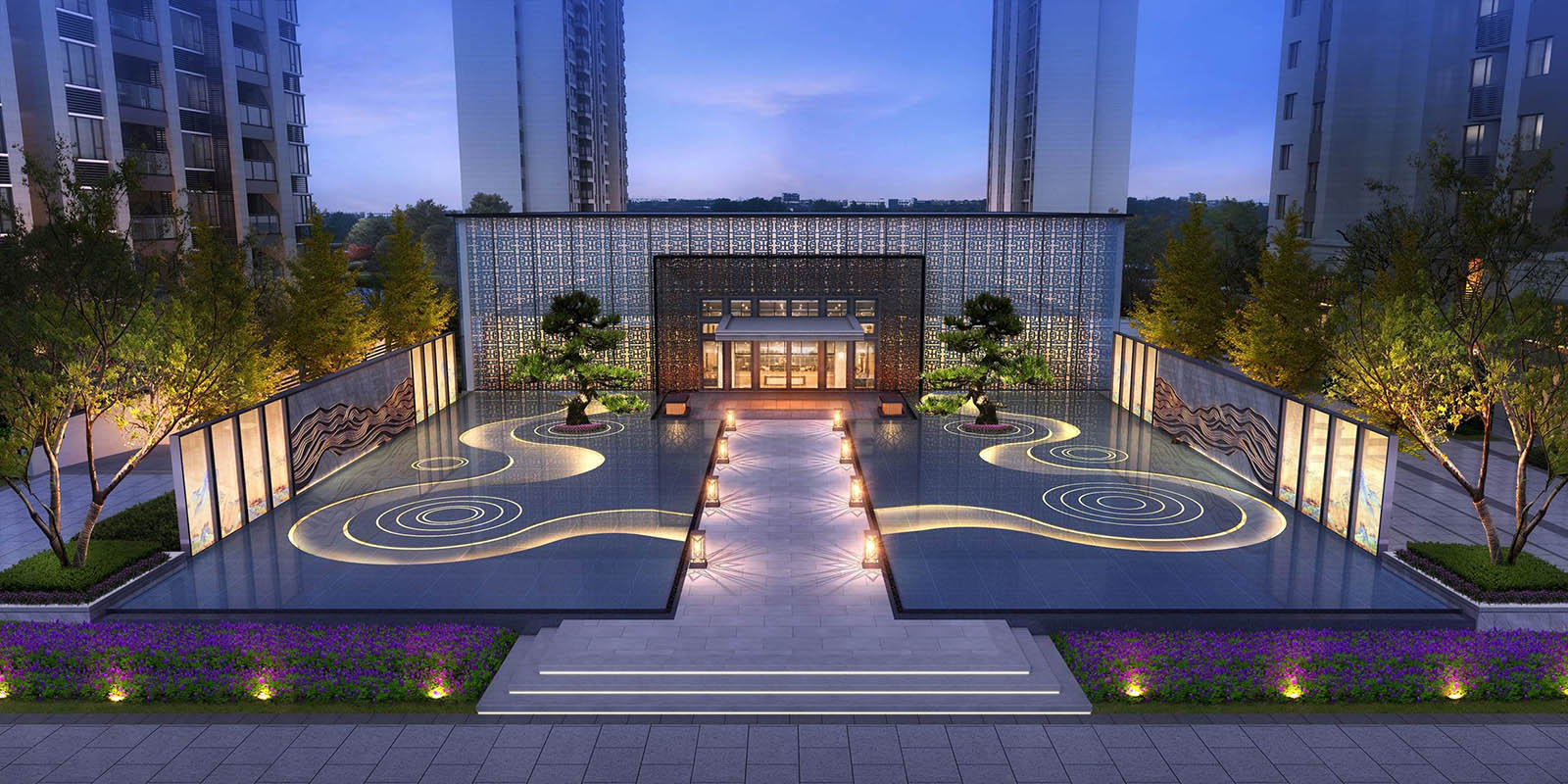 鏡面水景及景墻屏風的脈絡肌理與地塊東側的南湖相呼應,以此與南湖·水岸逸墅案名產生共鳴,景觀將月印萬川,處處皆圓為文化內涵具象,寓意萬川歸源,圓融無礙,精英階層的生活處事態度與精神追求。