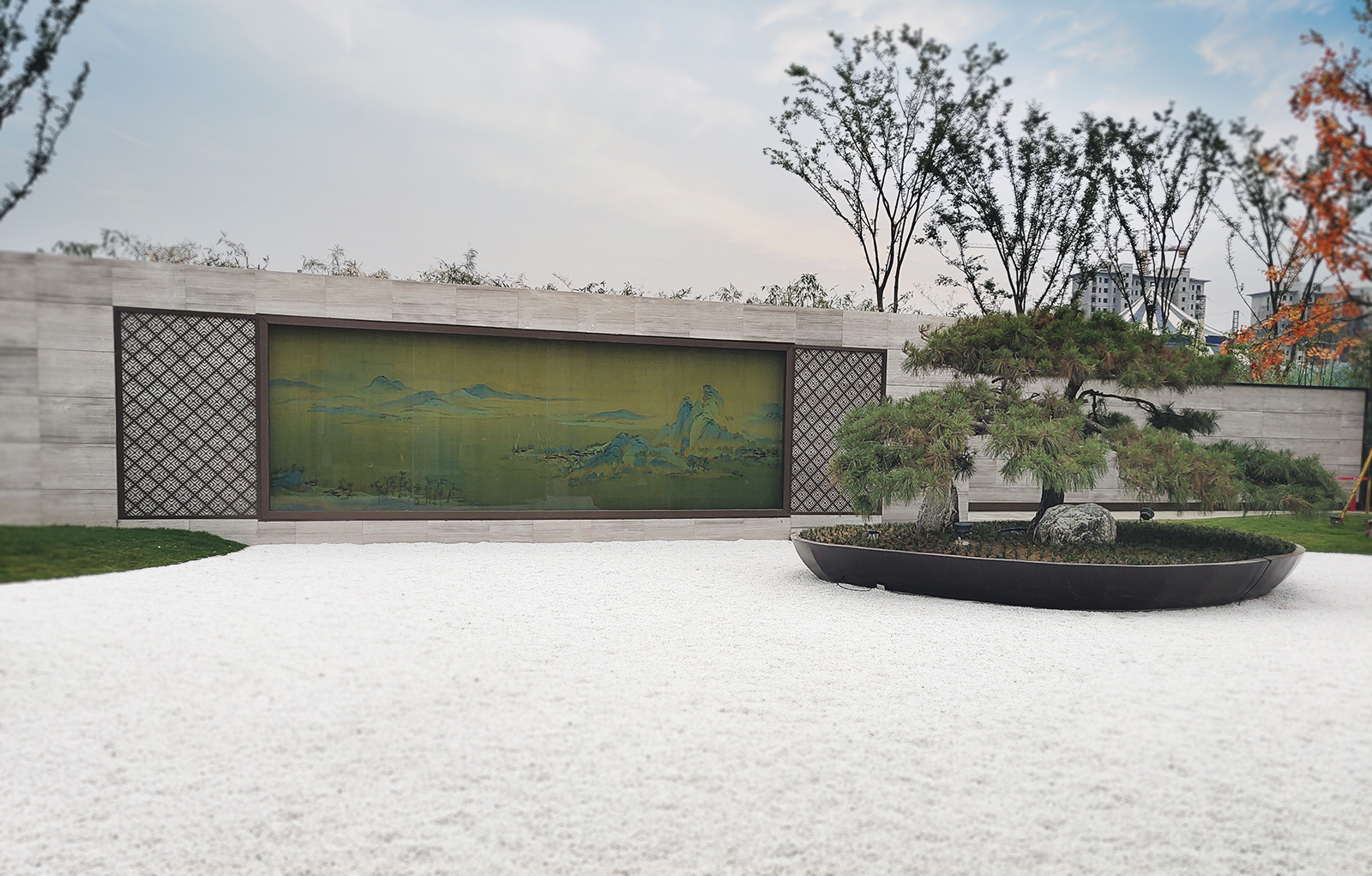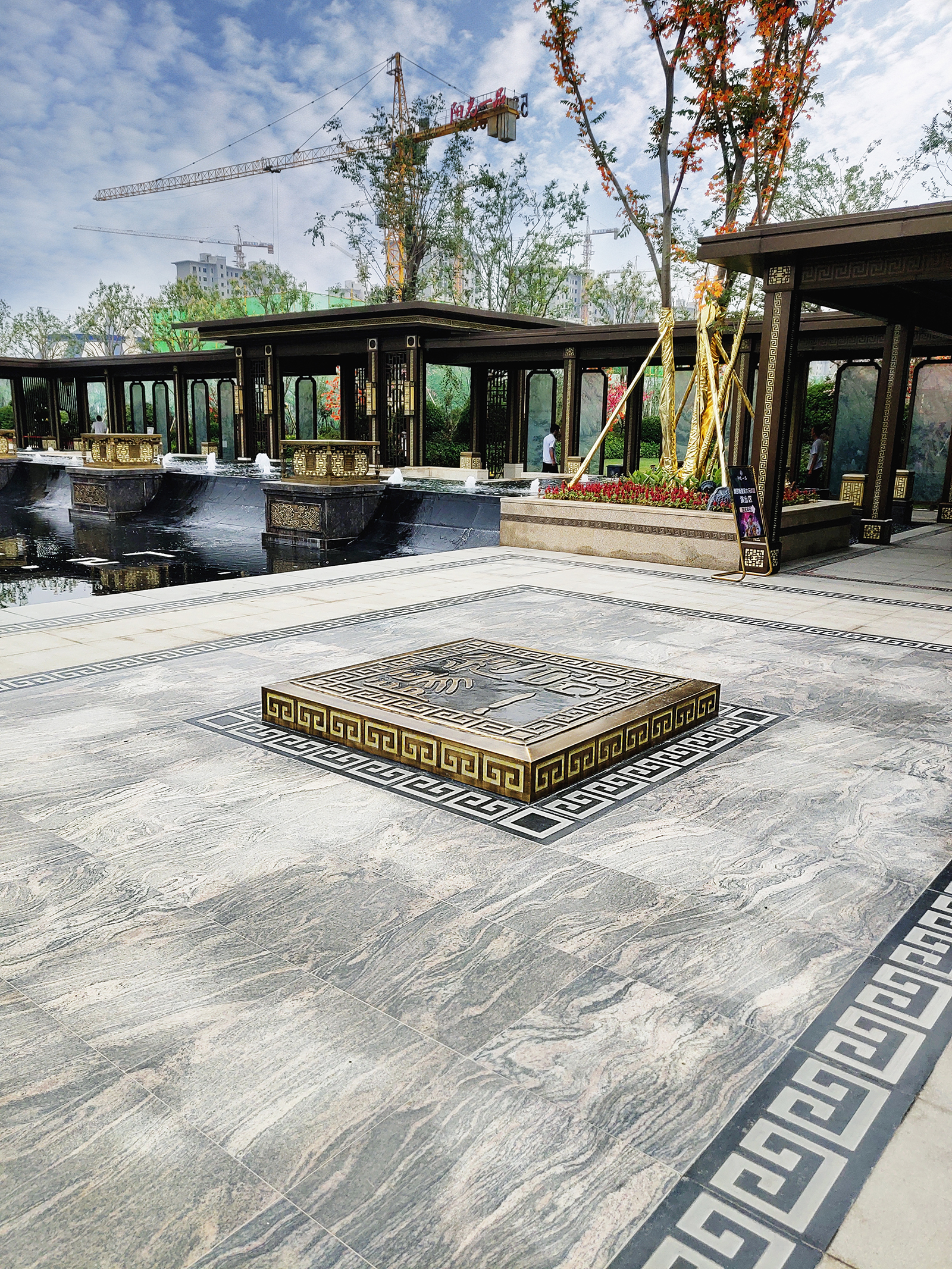 鏡面水景輕靈、優(yōu)雅、致韻;雙排四座宮燈雕琢萬(wàn)字符,寓意前程萬(wàn)福。