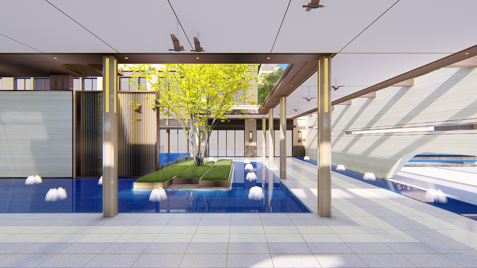 迎賓廣場平坦開闊,疊水水景與臺階組合現代、精致、優雅,水景布置有鵲歸巢主題雕塑,禮迎業主歸家,彰顯小區尊享品質。