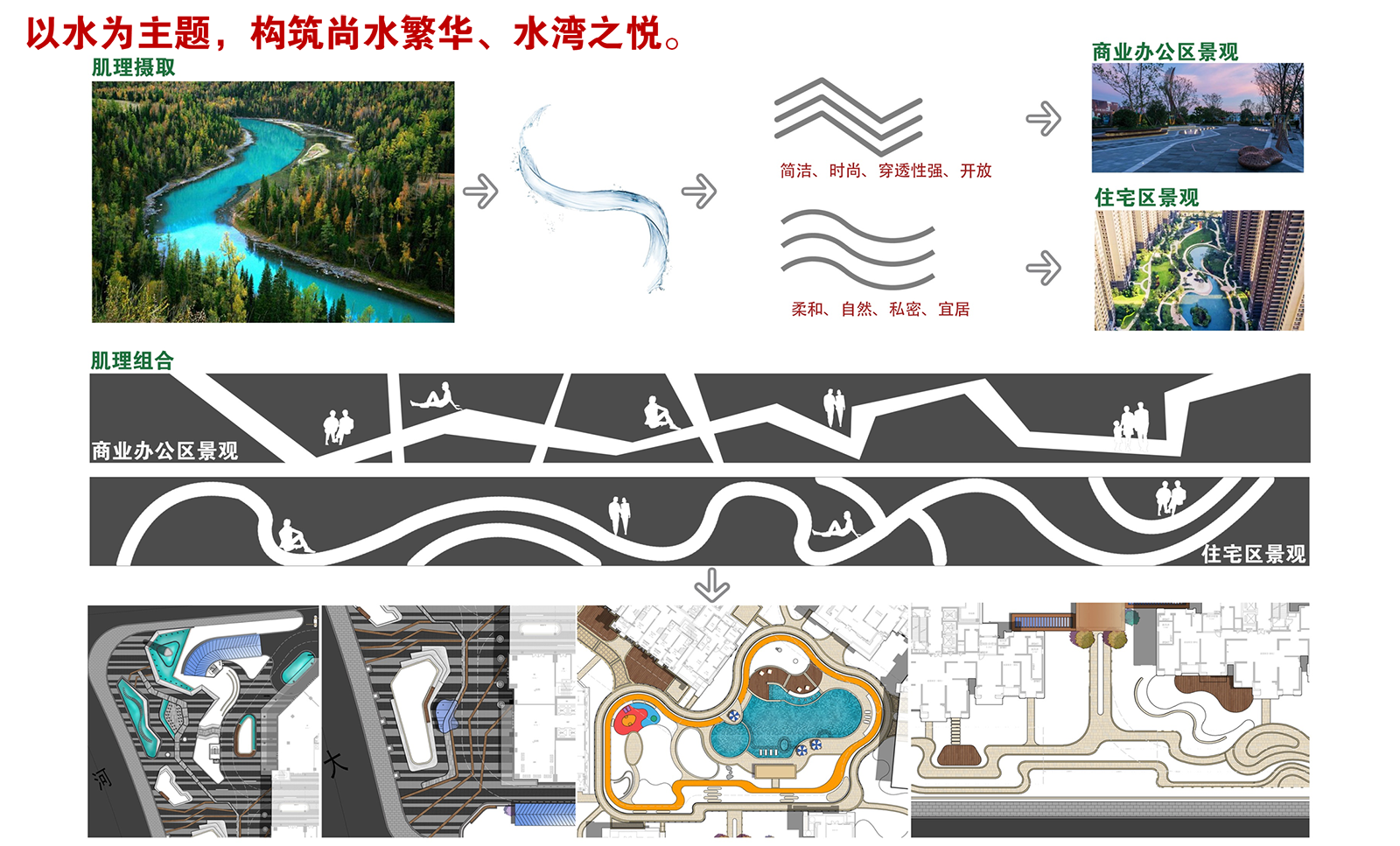 方案以大都會酒店式設計手法,嵌入式、下沉式的休閑平臺包融在水景之中,將人的親水性抒發到極致,曲線肌理柔和浪漫,與本案水脈共生主題相呼應,極休閑、極雅致、極愜意。