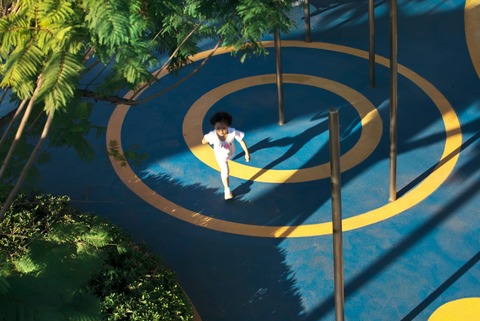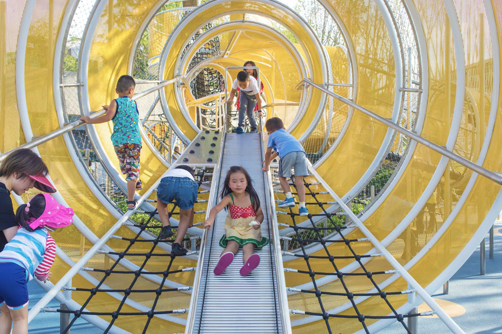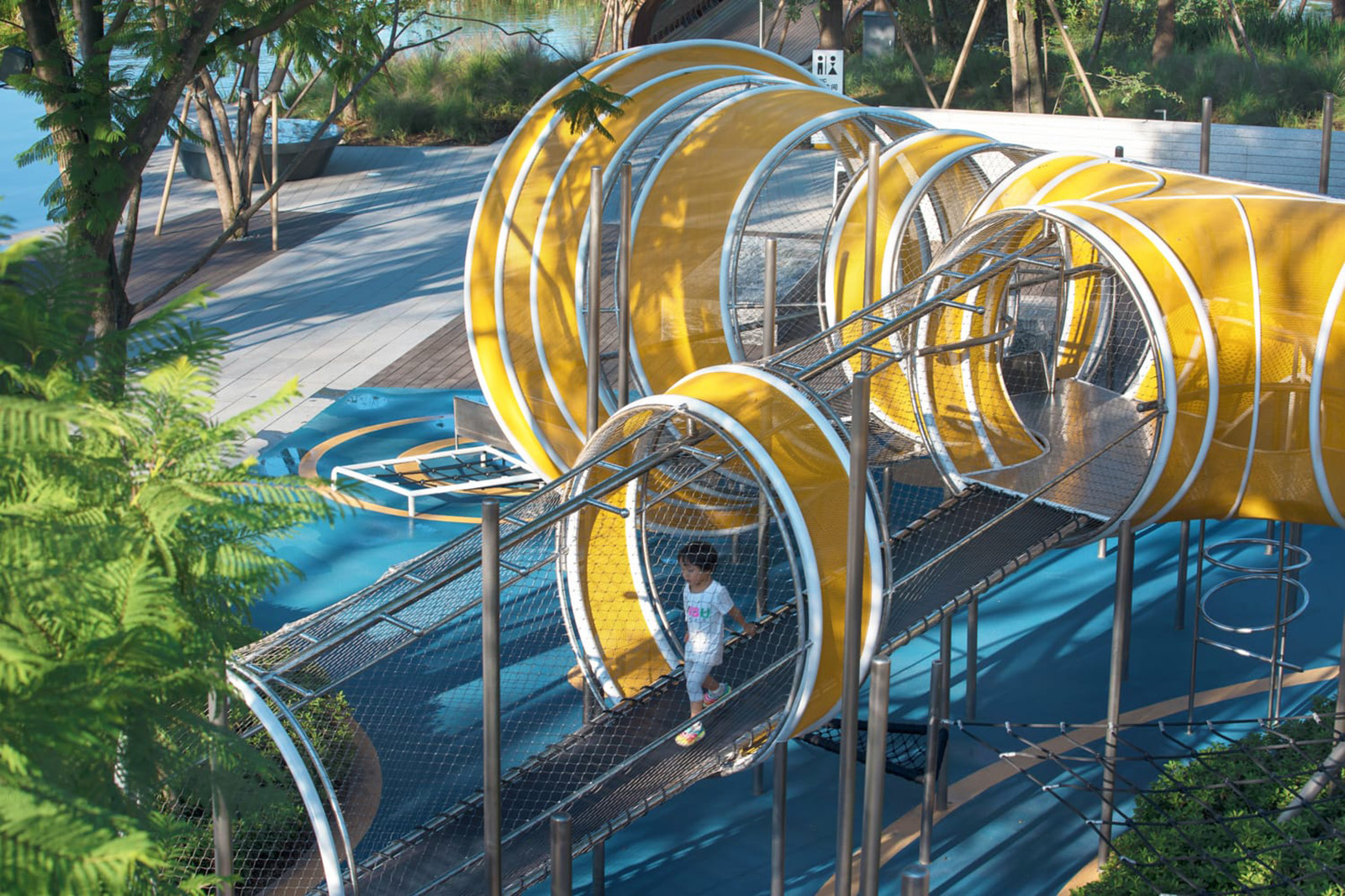 以學齡大童冒險為設計主題,架空的冒險管道、吊橋、方盒子滑梯等設計,激發兒童的探索欲、合作精神、冒險精神。拓展兒童的空間想象力。同時林蔭大樹與器械相結合,探險空間猶如穿梭、浮空在林中,兒童伸手能觸碰到大樹的枝條,更加增強了兒童與自然的互動。