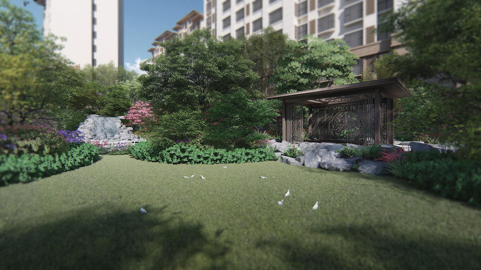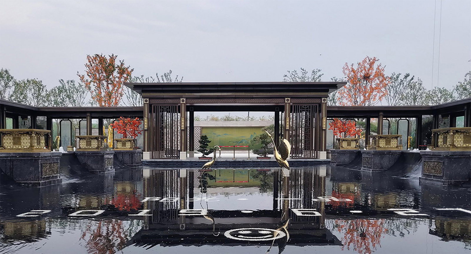 鏡面水景輕靈、優雅、致韻;雙排四座宮燈雕琢萬字符,寓意前程萬福。