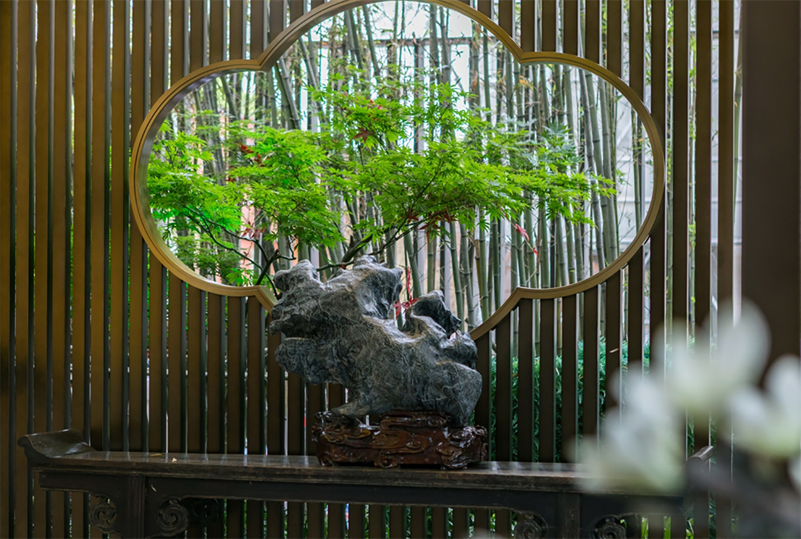 整個展示區景觀采用三進禮敘,一進精制禮儀,禮儀迎賓,二進后場景觀迂回式設計,百轉千回之后,一席東方府邸從容呈現,三進無邊際泳池水景展開,空靈靜美,引導業主進入具有濃郁東方韻味的山水之境。